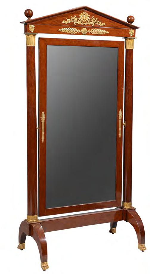 62. American Late Classical Carved Mahogany Mirror-Back Dressing Chest, 19th c., mirror with shaped crest, on tapered supports and glove drawers, cased long drawers below, flanked by colonettes, scroll feet, 91 x 47 1/2 x 24 in. (231.1 x 120.7 x 61 cm.)