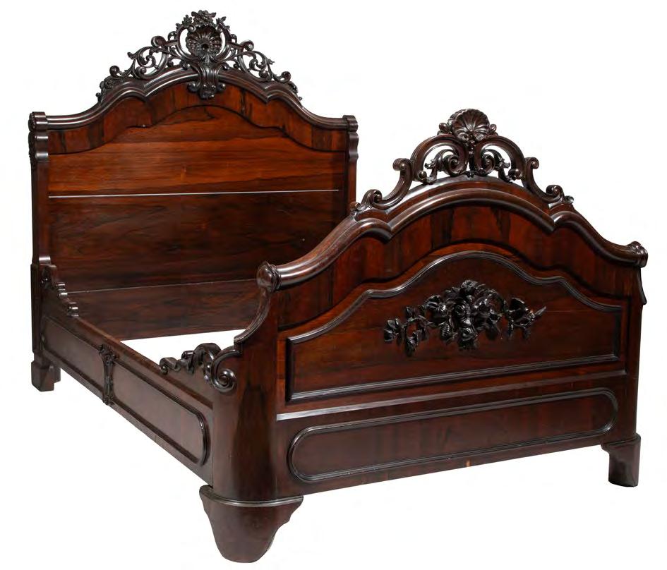 36. American Rococo Carved Rosewood Bedstead, 19th c., New York, possibly Alexander Roux, pierced C-scroll and shell carved crest, paneled molded headboard, conforming rails and footboard, 63 x 56 1/2 x 78 1/2 in. (160 x 143.5 x 199.4 cm.) [1500 / 2500]