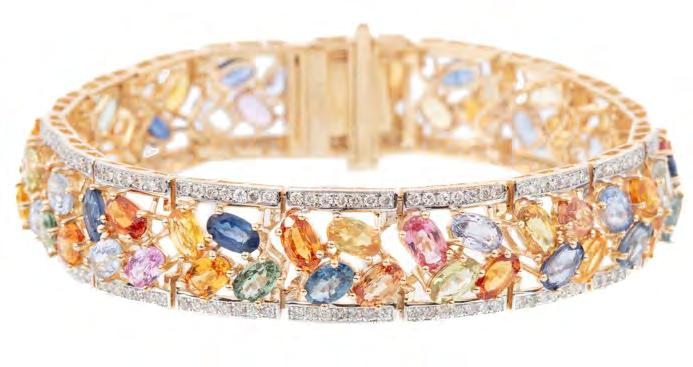 589. Platinum and Multicolor Sapphire Line Bracelet, mounted with 30 octagonal step faceted cut multicolor sapphires, total wt. approx. 18.08 cts.; l. 7 in.; GGA and GIA reports.Please Note: Payment for all jewelry and all couture items MUST be made by cash, check or wire transfer., [4000 / 6000]