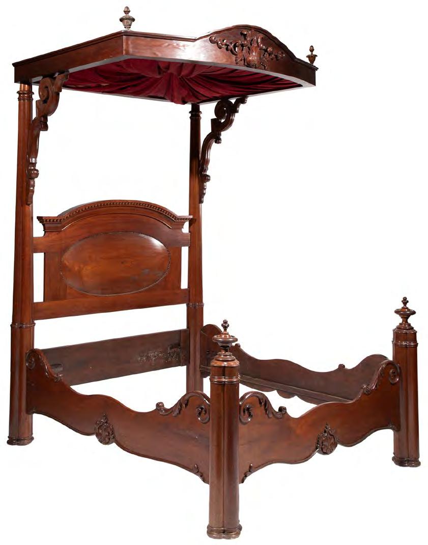 106. American Rococo Carved Mahogany Half Tester Bed, 19th c., labeled William McCracken, New Orleans, stamped 26, rebuilt arched molded tester, scrolled arms, cluster column postsarched molded paneled headboard, conforming molded rails and footboard, 110 x 62 x 77 1/2 in. (279.4 x 157.5 x 196.9 cm.)