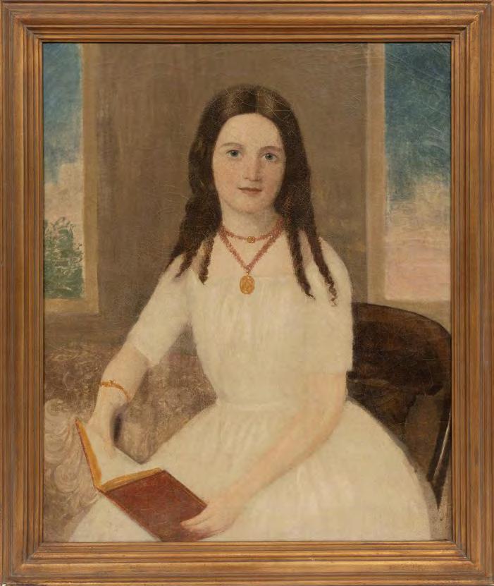 90. American School 19th c. “Young Girl Reading a Book”, unsigned, framed., 34 1/4 x 28 in. (87 x 71.1 cm.), Frame: 39 1/4 x 33 1/4 x 2 in. (99.7 x 84.5 x 5.1 cm.)