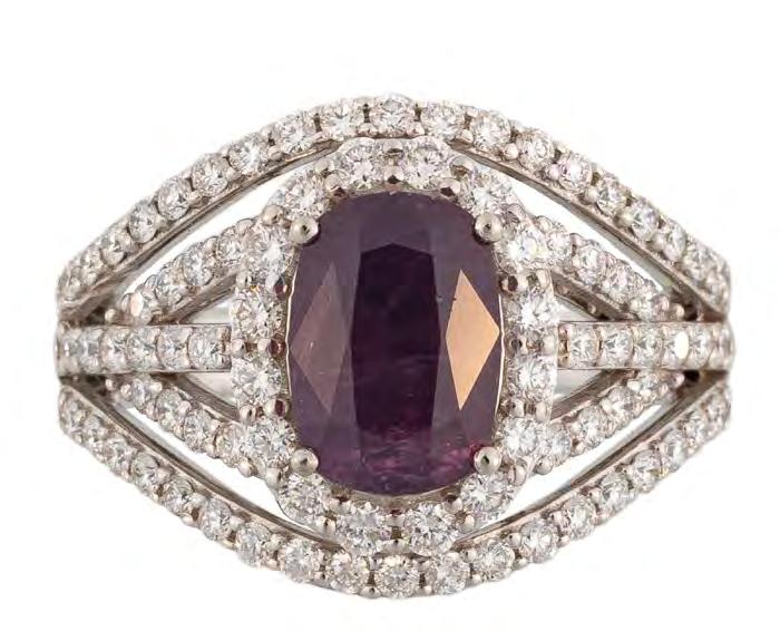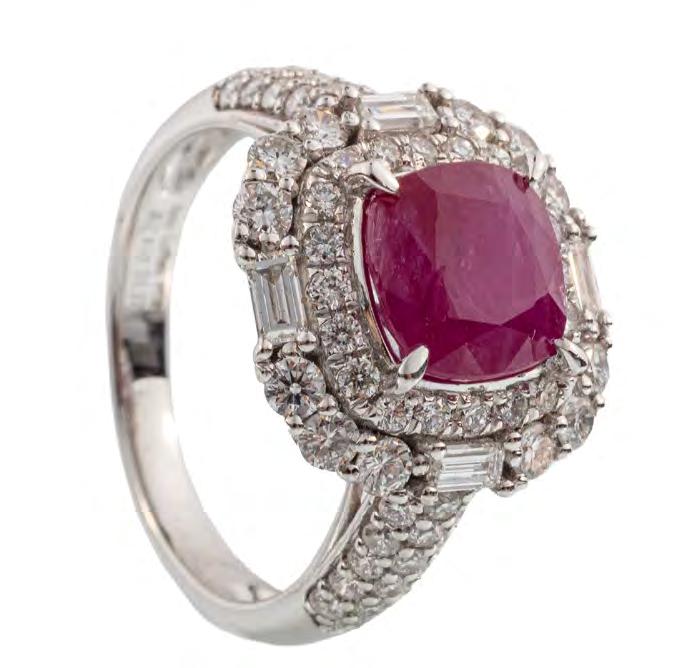 578. Platinum, Burmese Ruby and Diamond Ring, GIA certified cushion mixed cut Burmese ruby, wt. approx. 2.41 cts.; double bezel and shoulders with 68 diamonds, total wt. approx. 1.22 cts.; size 6.75; AIGL and GIA reports.Please Note: Payment for all jewelry and all couture items MUST be made by cash, check or wire transfer., [2500 / 3500]