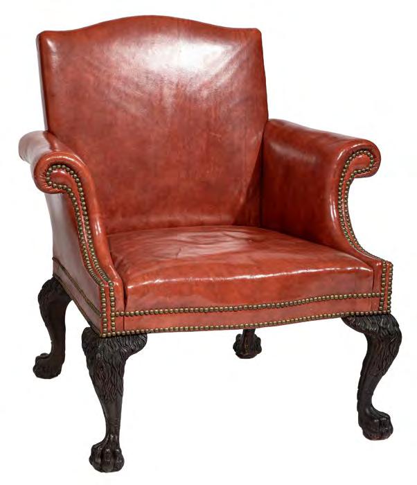 56. American Classical Carved Mahogany Mechanical Library Chair, 19th c., probably Boston, tuffed leather upholstery, reclining back, scrolled padded arms, turned legs, 42 1/2 x 26 x 25 in. (108 x 66 x 63.5 cm.)