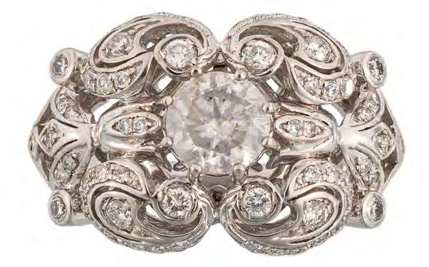 576. 14 kt. White Gold, Diamond and Ruby Ring, center round diamond, wt. approx. 0.58 cts.; bezel with numeround oval rubies; size 6.25; 3.95 dwts.Please Note: Payment for all jewelry and all couture items MUST be made by cash, check or wire transfer., [800 / 1200]