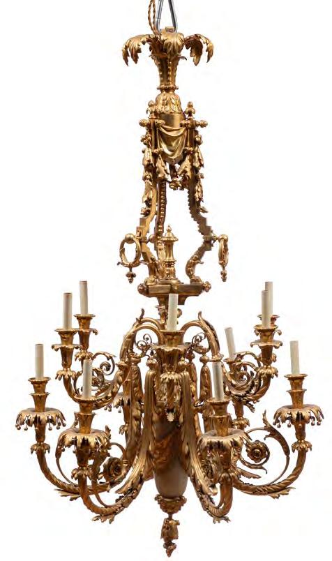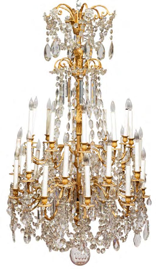 108. Fine Louis XV-Style Gilt Bronze and CutCrystal Thirty Light Chandelier, c. 1890, vasiform standard, foliate arms, hung with scalloped and spear prisms, rosettes, and chains, ending in a bronze fruit pendant and blown glass sphere, h. 65 in., dia. 35 in.
