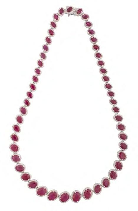 581. Platinum, Ruby and Diamond Necklace, mounted with 51 graduated oval brilliant faceted cut Mozambique rubies, total wt. approx. 55.39 cts.; bezels with 1032 round brilliant cut diamonds, total wt. approx. 4.32 cts.; l. 17 1/2 in.; GGA and GIA reports.Please Note: Payment for all jewelry and all couture items MUST be made by cash, check or wire transfer., [10000 / 15000]