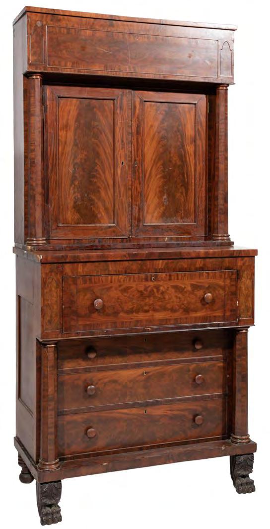 55. American Classical Figured Mahogany Secretary Bookcase, mid-19th c., probably Baltimore, the massive frieze with banded and Gothic panels on faceted columns flanking paneled doors; the lower case with escritoire drawer over graduated drawers flanked by colonnettes, paw feet, 99 x 47 1/2 x 24 1/2 in. (251.5 x 120.7 x 62.2 cm.)