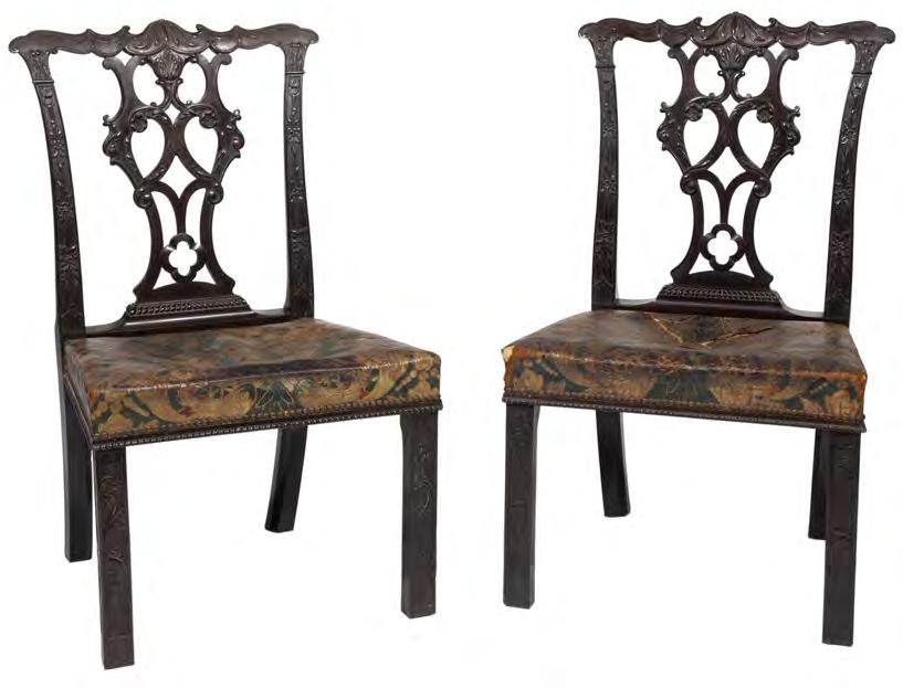 33. Fine Set of Eight American Rococo Carved Rosewood Dining Chairs, 19th c., attributed to Alexander Roux, New York, foliate carved crest rail, padded back and seat , conforming seat rail, beaded tapered legs, castors, 41 x 20 x 18 1/4 in. (104.1 x 50.8 x 46.4 cm.) [2000 / 3000]