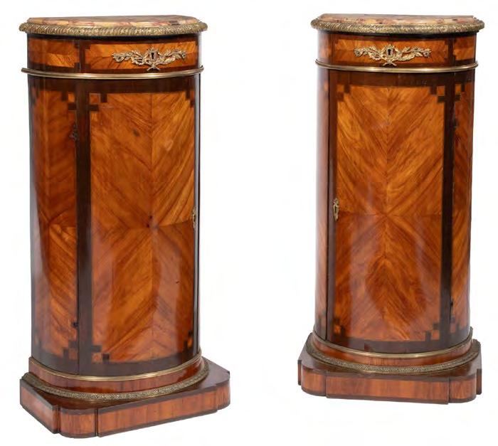 in The Opulent Interiors of the Golden Age, pg. 163, image 182. Little is known about the supplier of furnishings to Charles Oliver’s many homes. This exquisitely inlaid parlor cabinet offered here is closely related to some of the finest examples of aesthetic furniture by the New York firm of Pottier & Stymus. Specifically, intricately inlaid mixed metal patterns closely related to furniture from the Mark Hopkins residence in San Francisco. Additionally, Pottier & Stymus used a five-digit numbering system prior to 1888 that was either penciled, impressed, or stenciled in black ink. This parlor cabinet bears a five-digit number in black ink 68511. Kristin Herron documented in her article on the Thomas Edison home at Glenmont that numbers were likely assigned chronologically and furniture dating to the early 1880s, such as this cabinet, were marked with numbers between 50000 and 70000.Reference: Herron, Kristin S., The Modern Gothic Furniture of Pottier and Stymus,”Magazine Antiques. May 1999.