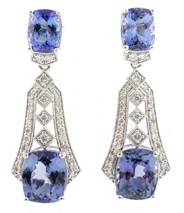 592. Pair of Art Deco Style Platinum, Tanzanite and Diamond Dangle Earrings, mounted wit 4 rectangular cushion brilliant cut tanzanite, total wt. approx. 14.60 cts.; drops with 64 round brilliant cut diamonds, total wt. approx. 0.95 ct., F-G color, VS1-VS2 clarity; l. 1 1/2 in.; GGA report. [5000 / 7000]