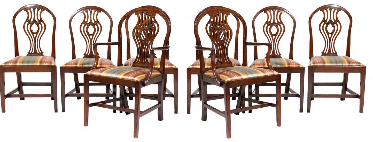 54. Set of Six American Victorian Carved Rosewood Dining Chairs, late 19th c., two arms, four sides, carved molded rounded crest rail, pierced carved knot back, shaped seat rail, cabriole legs, casters., arm 39 1/2 x 24 1/2 x 23 in. (100.3 x 62.2 x 58.4 cm.), side 34 1/2 x 19 x 19 in. (87.6 x 48.3 x 48.3 cm.)