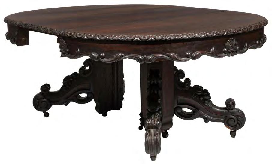 32. American Rococo Carved Rosewood Extension Dining Table, 19th c., Att. to Alexander Roux, New York, carved molded edge, scrolled foliate apron, scrolled foliate legs, 4 leaves. At full extension, the table measures 16 ft. Without the four leaves, the table does not form a perfect circle, its measurements are h. 31 1/2 in., w. 53 in., d. 60 in., h. 31 1/2 in. (80 cm.), d. 60 in. [2500 / 3500]