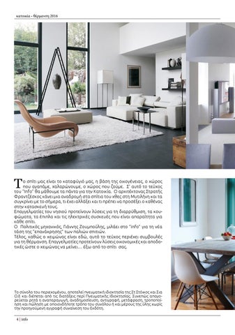ο σπίτι μας είναι το καταφύγιό μας, η βάση της οικογένειας, ο χώρος που αγαπάμε, χαλαρώνουμε, ο χώρος που ζούμε. Σ’ αυτό το τεύχος του “Info” θα μάθουμε τα πάντα για την Κατοικία. Ο αρχιτέκτονας Στρατής Φραντζέσκος κάνει μια αναδρομή στα σπίτια του χθες στη Μυτιλήνη και τα συγκρίνει με το σήμερα, τι έχει αλλάξει και τι πρέπει να προσέξει ο καθένας στην κατασκευή τους. Επαγγελματίες του νησιού προτείνουν λύσεις για τη διαρρύθμιση, τα κουφώματα, τα έπιπλα και τις ηλεκτρικές συσκευές που είναι απαραίτητα για κάθε σπίτι. Ο Πολιτικός μηχανικός, Γιάννης Ζουμπούλης, μιλάει στο “info” για τη νέα τάση της “επανάχρησης” των παλιών σπιτιών. Τέλος, καθώς ο χειμώνας είναι εδώ, αυτό το τεύχος περιέχει συμβουλές για τη θέρμανση. Επαγγελματίες προτείνουν λύσεις οικονομικές και αποδοτικές ώστε ο χειμώνας να μείνει… έξω από το σπίτι σας.
