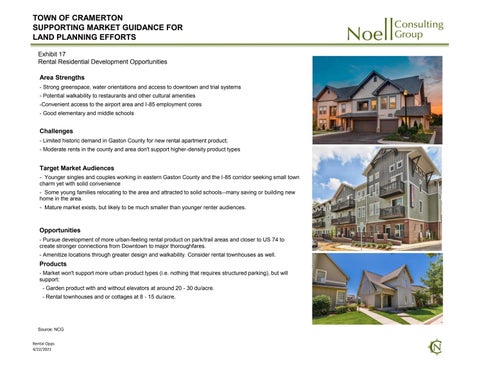 TOWN OF CRAMERTON SUPPORTING MARKET GUIDANCE FOR LAND PLANNING EFFORTS Exhibit 17 Rental Residential Development Opportunities Area Strengths - Strong greenspace, water orientations and access to downtown and trial systems - Potential walkability to restaurants and other cultural amenities -Convenient access to the airport area and I-85 employment cores - Good elementary and middle schools
