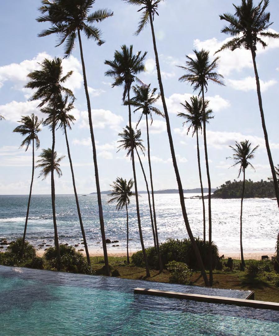 the way –down a rocky, dusty side road leading to the coast. What slowly appears before the car is a 30-acre property on the hillside and an 800-metre beach of the sea deep and blue, not for swimming, but a haven for surfers. Most guests come to Amanwella to hide away in their villa and on the beach –but one evening we venture out to a local beach shack to enjoy fresh fsh and chips and Sri Lankan beer to the sound of waves. Smoke & Bitters, the only Sri Lankan-owned bar in Asia’s 50 Best Bars, is 30 minutes by car and well worth the journey.