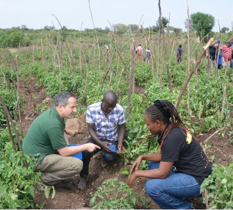 "Com os colegas da Bayer, Frederik Nyambare e Diana Gitonga, a avaliar um campo de tomate de um pequeno agricultor em Meru, no Quénia (2017)"