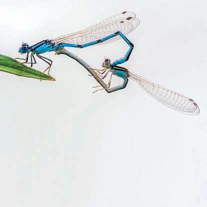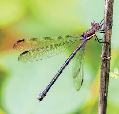 CLOCKWISE FROM LEFT A female eastern pondhawk dragonfly; dragonflies and damselflies have compound eyes made up of thousands of tiny eyes called ommatidia. The eastern amberwing is one of the only dragonflies that mimics a wasp. The great spreadwing is one of the largest damselflies in North America, with a length up to 2.4 inches, a 3-inch wingspan and a notable yellow stripe. A male eastern pondhawk with its prey.