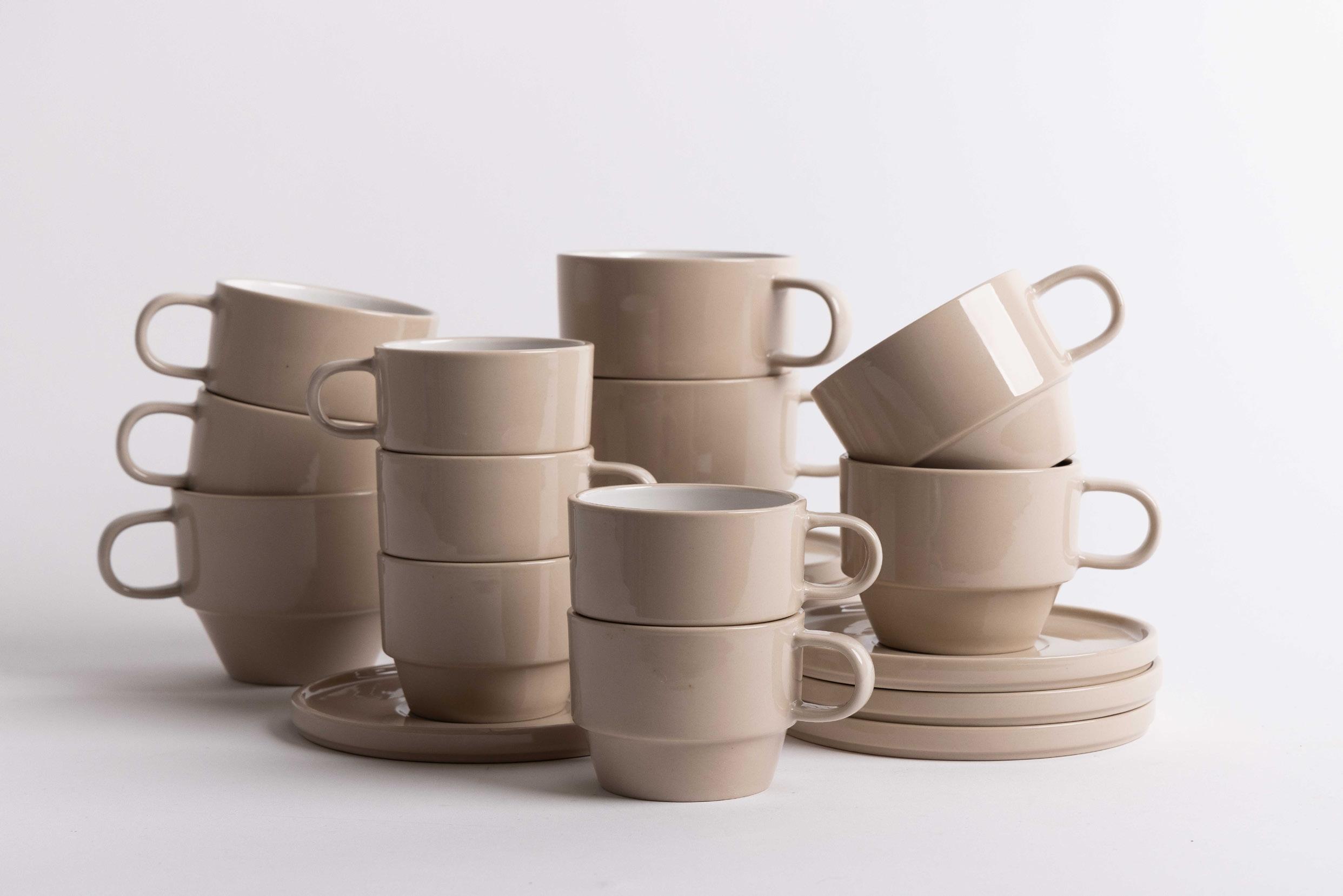 Introducing Hudson, a collection of perfect workhorses. Stackable mugs crafted with a blend of modern aesthetics and traditional techniques. Each piece is finished with a semi-gloss glaze in cashmere, giving it a distinct and unique character. While remaining completely functional for commercial settings was at the forefront of the design, there was no compromises on looks. Featuring an narrowed base for storing ease, these generously sized mugs are ideal for enjoying your first coffee of the day.