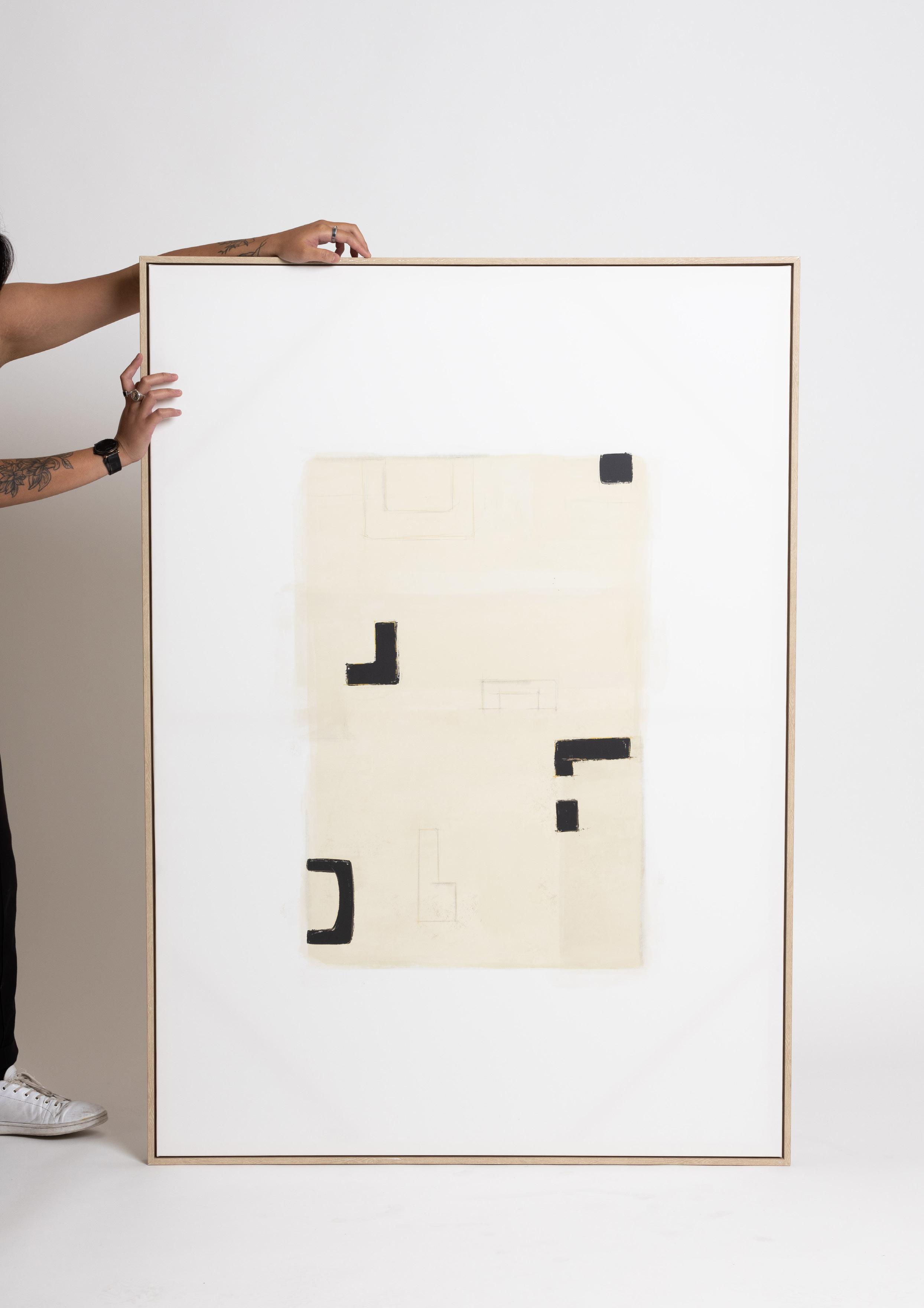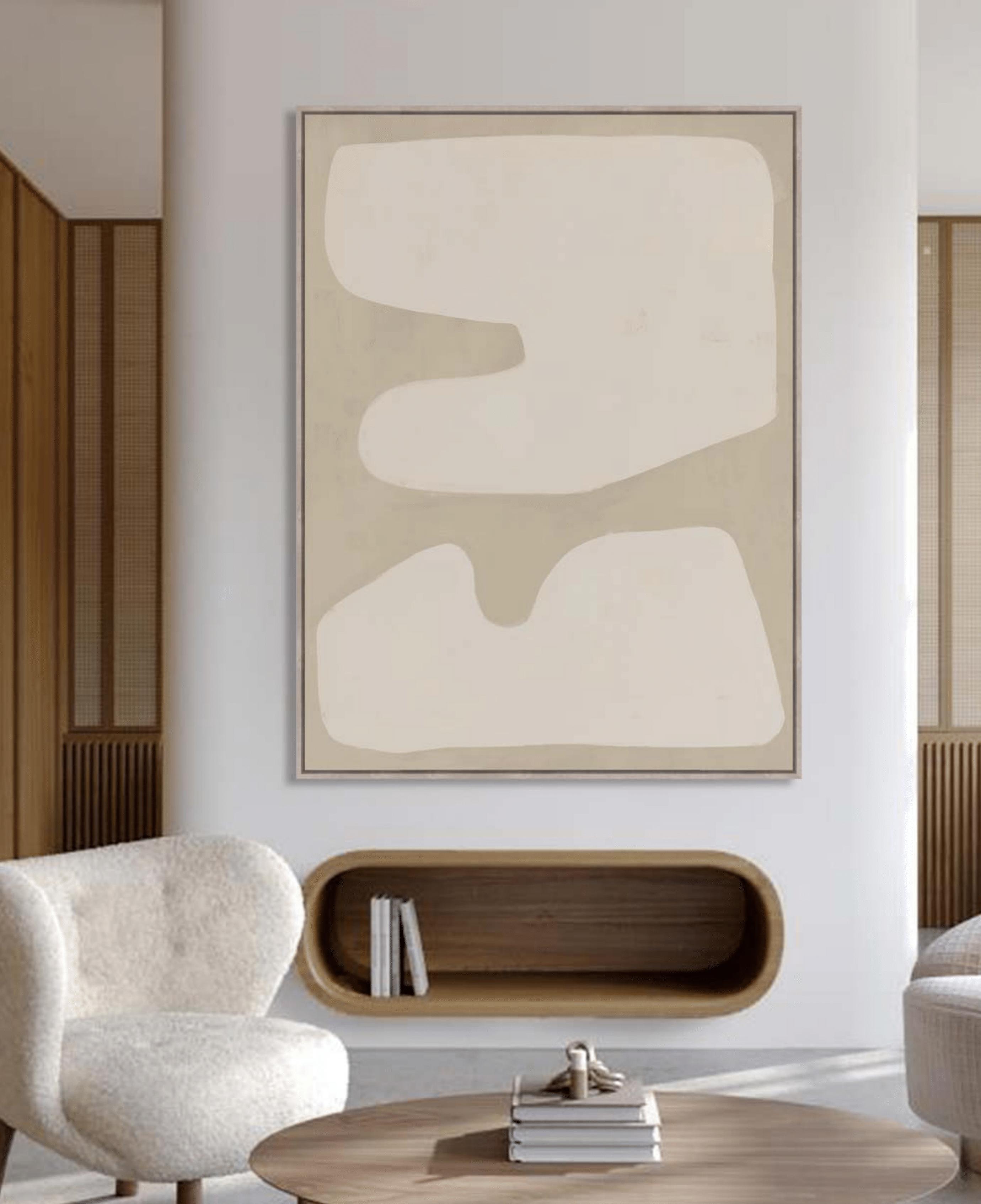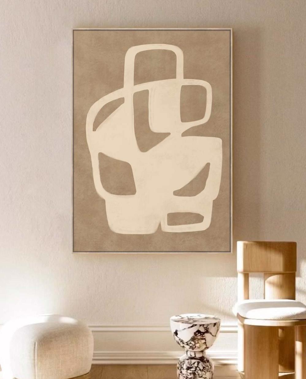 Gorgeous three dimensional texture of these prints relates earthy and organic feelings, in creating a cozy, inviting home. Substantial in size, curvaceous forms interlock with bold imperfect lines and shapes to create an artwork that is strikingly confident and interesting, yet subtle enough in its neutral tones to compliment any interior space. Encased in a shadow box frame, each piece is individually hand painted on linen canvas