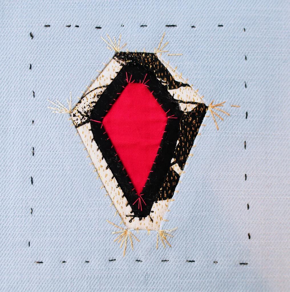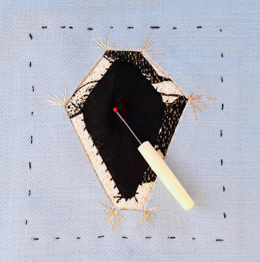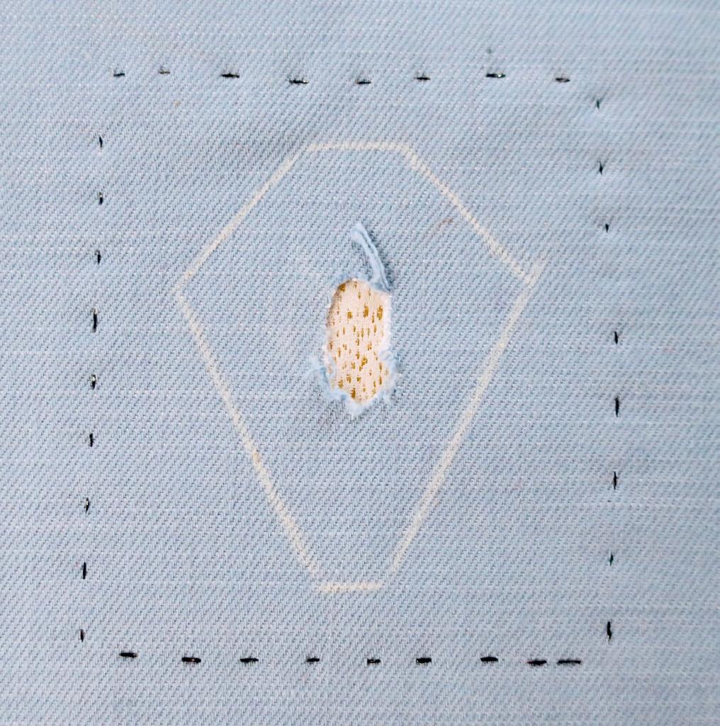 Vouw nu de 6 flapjes naar binnen toe en speld ze vast op de onderlaag: dit gat is kleiner dan het eerste, en geeft diepte aan de (edel)steen vorm. Naai met zichtbare overhandse steekjes langs de randen van het gat de bovenstof op de onderstof.