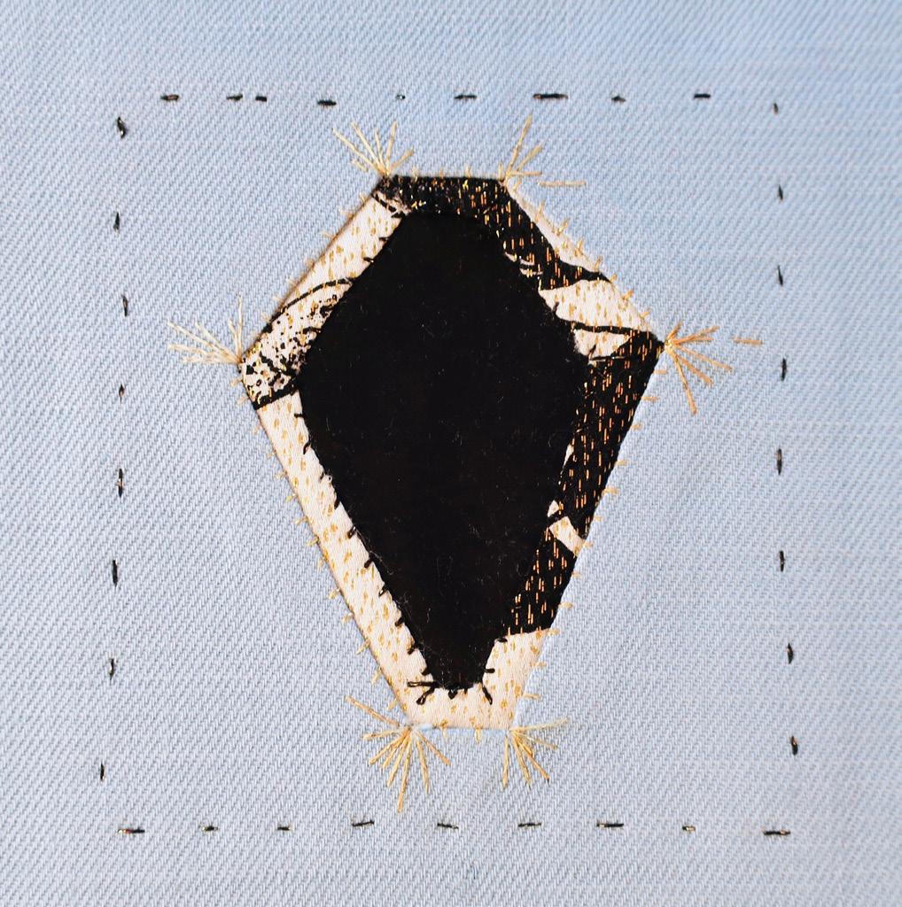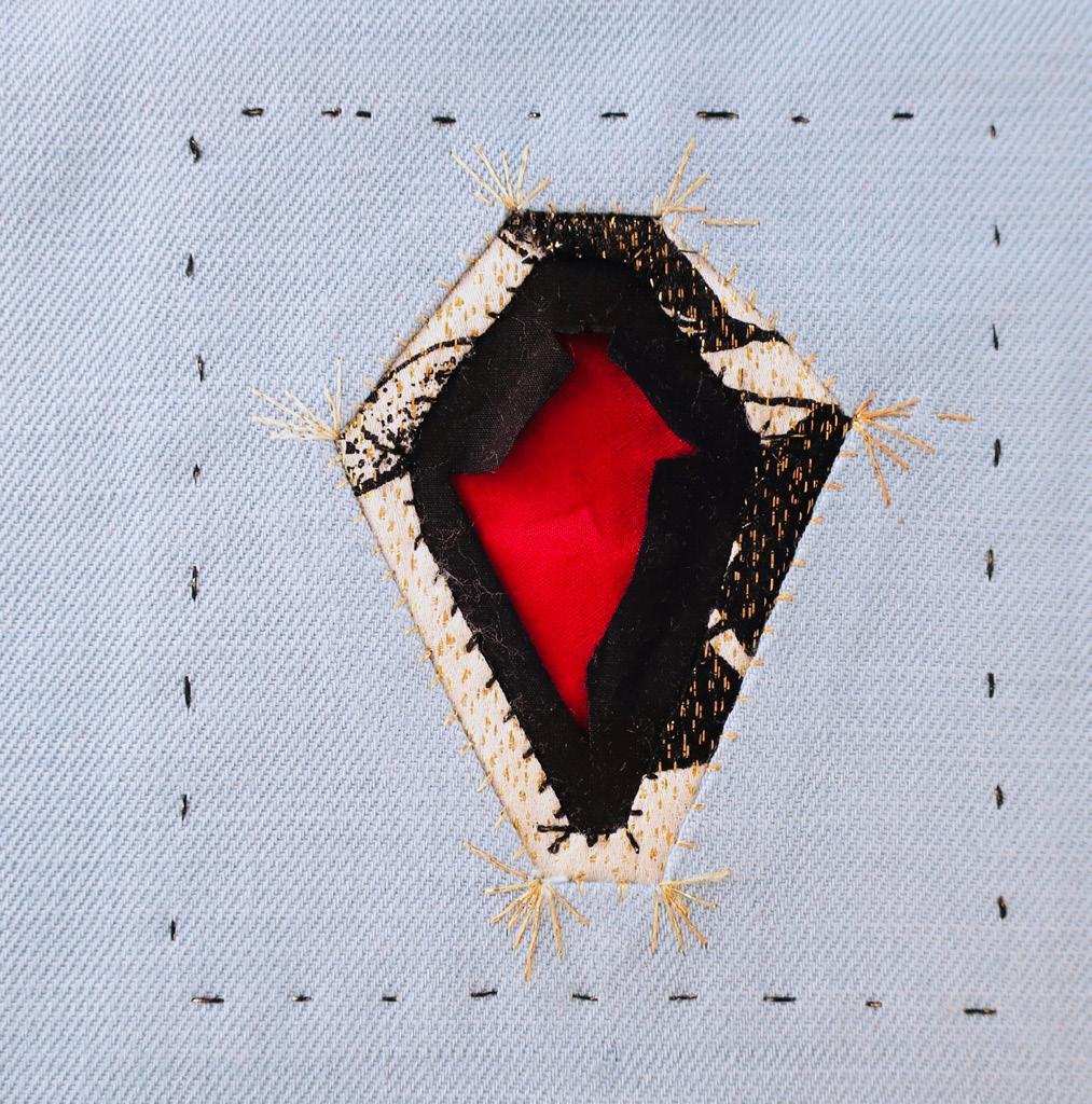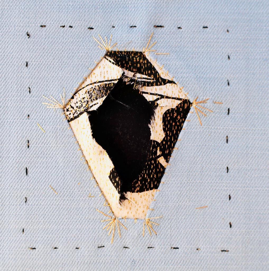 Vouw nu de 6 flapjes naar binnen toe en speld ze vast op de onderlaag: dit gat is kleiner dan het eerste, en geeft diepte aan de (edel)steen vorm. Naai met zichtbare overhandse steekjes langs de randen van het gat de bovenstof op de onderstof.