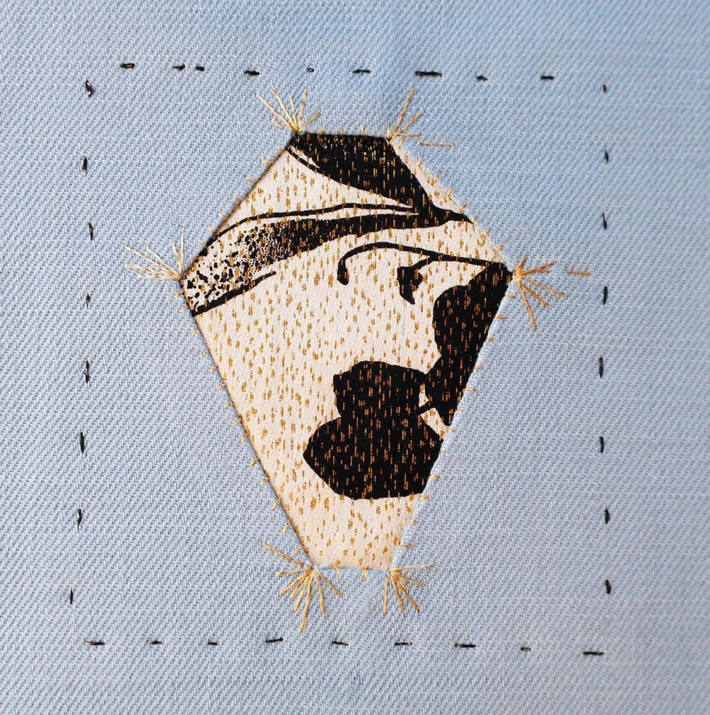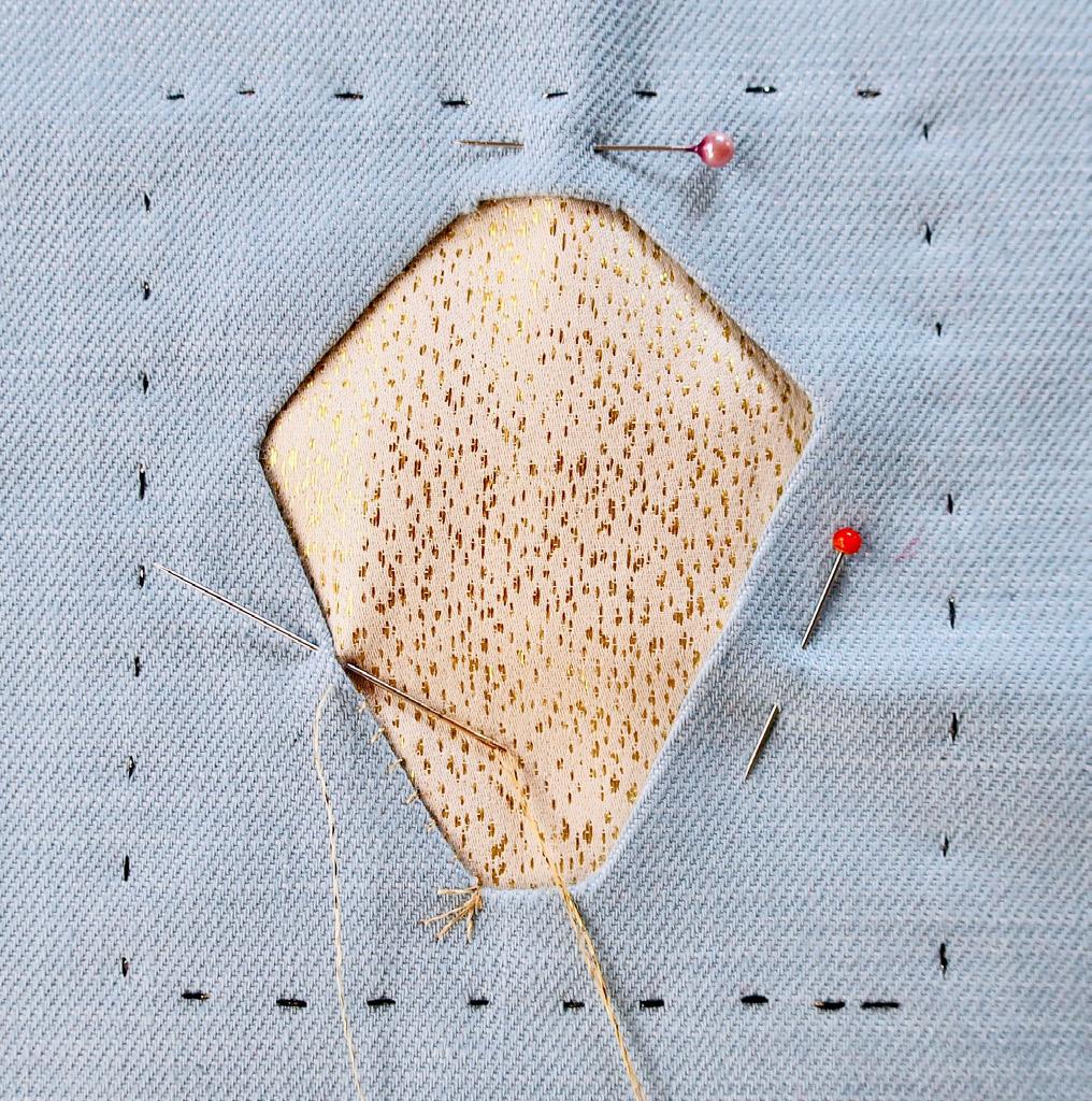 Vouw nu de 5 flapjes naar binnen toe en speld ze vast op de onderlaag: kies weer een mooie kleur draad en naai met zichtbare overhandse steekjes langs de randen van het gat de bovenstof op de onderstof.