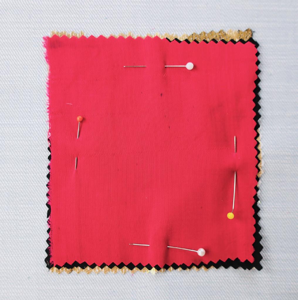 Draai het kledingstuk/oefenlap binnenstebuiten en bedek het gat met het stapeltje lapjes, met de goede kant naar het gat toe. Speld het 2 cm langs de randen vast met kopspelden.