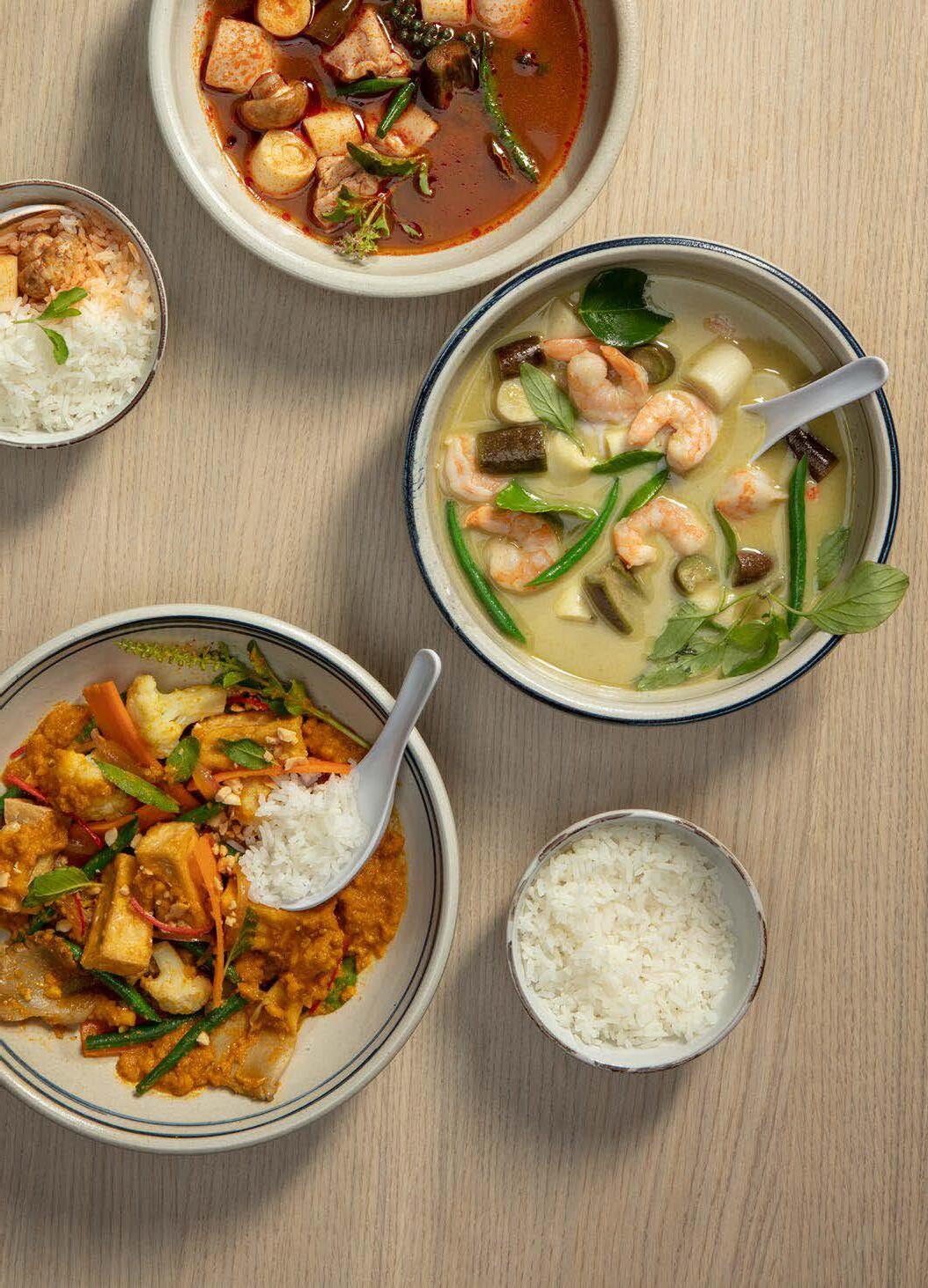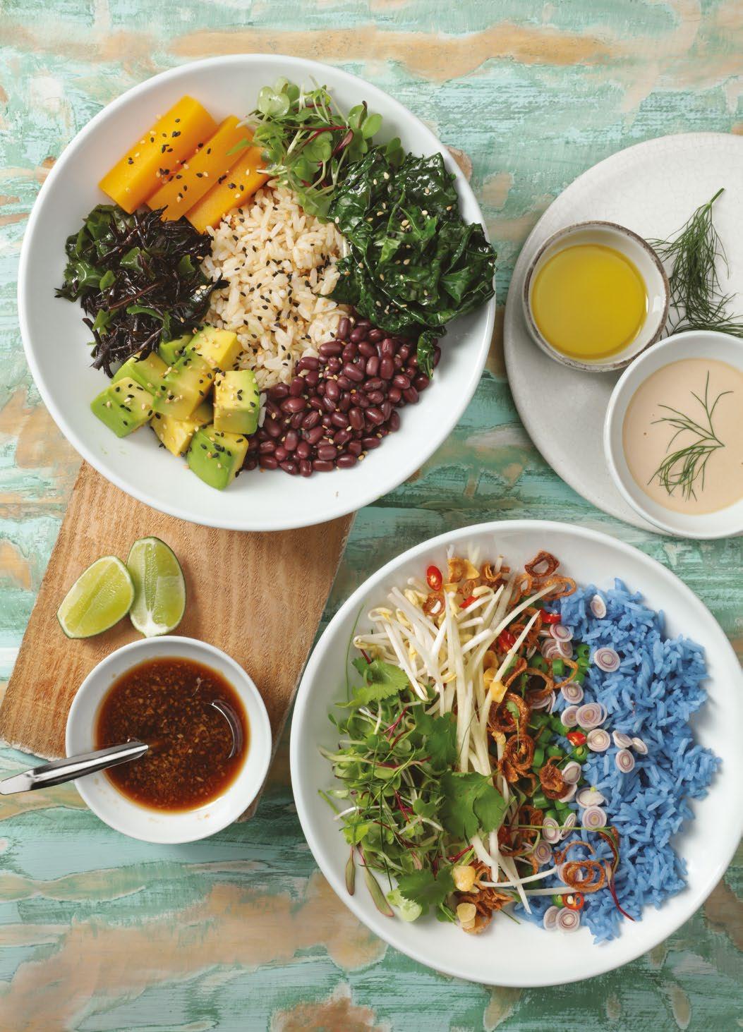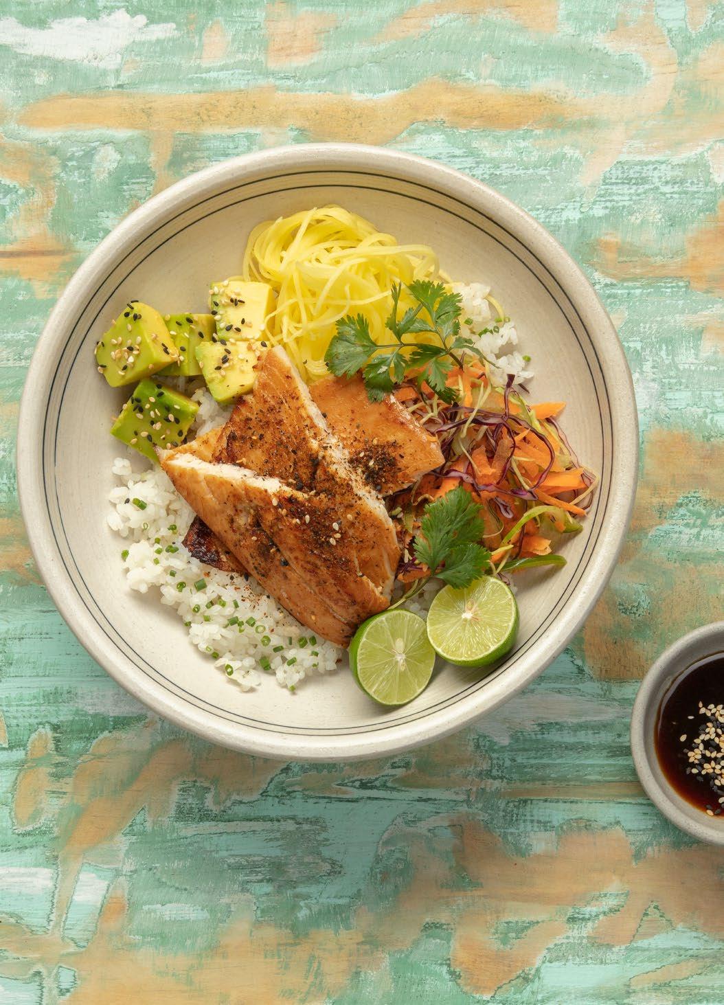 Arroz jazmín en infusión de flores, raíz china, cortes de papaya verde, habichuelín, limonaria, cilantro, germinados, cebolla ocañera crocante, hojas de limón kafir, chips de ajo y chile. Servida con una vinagreta a base de soya y jengibre. $20.900