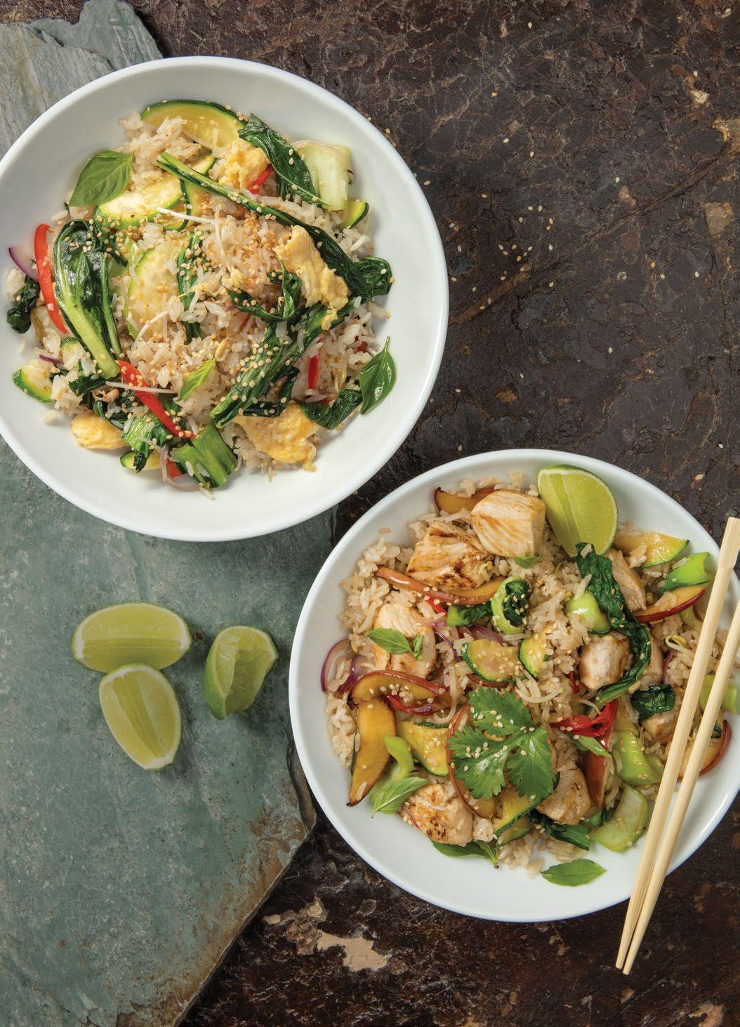 Acompañamientos: Arroz stir fry salteado al wok con arveja, huevo, cebollín y aceite de ajonjolí.