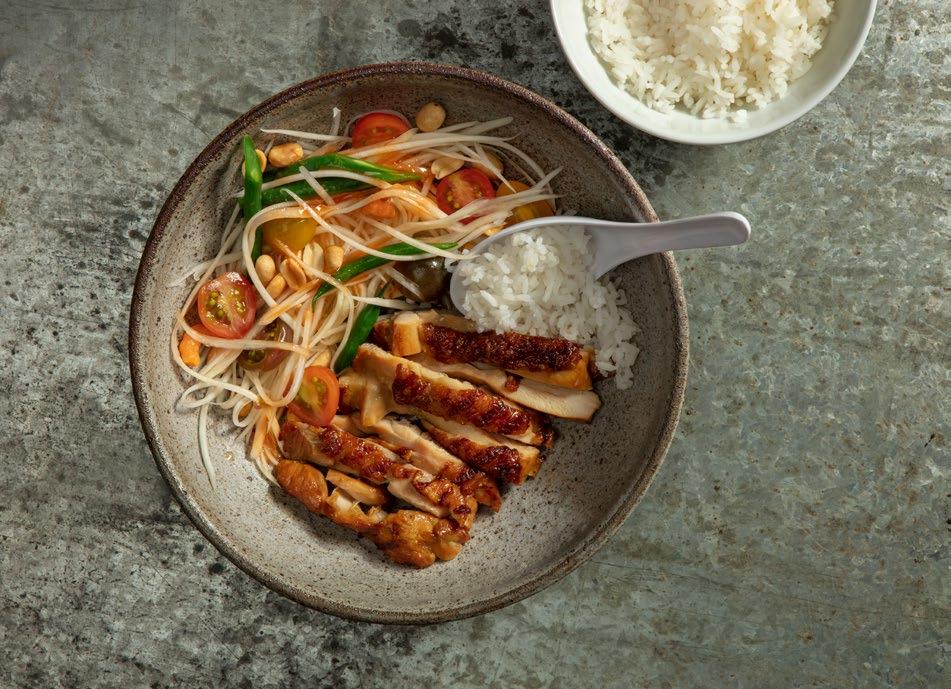 Pernil de pollo a la parrilla marinado en salsa soya y aceite de maní, ensalada de mango biche, marañón, hierbas, nam-pla, cebolla ocañera y chile, servido con salsa de chile dulce.