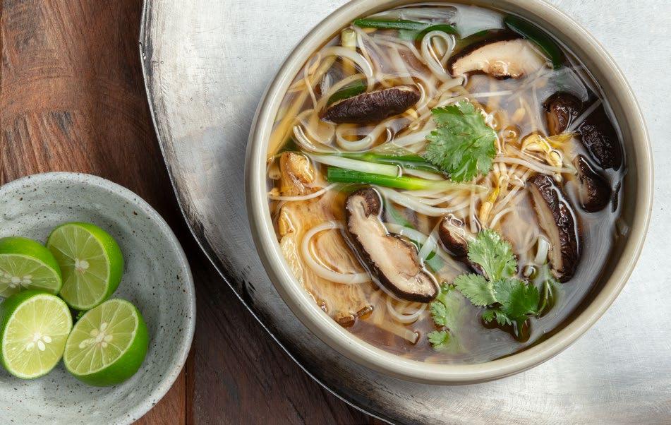 Consomé de vegetales, con pasta de arroz, cebollín oriental y cilantro. Servida con salsa sriracha y limón. $23.900