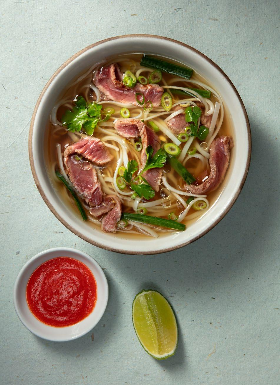 Consomé de pollo, con pasta de arroz, salsa de ostras, cebollín oriental y cilantro. Servida con salsa sriracha y limón. $34.900