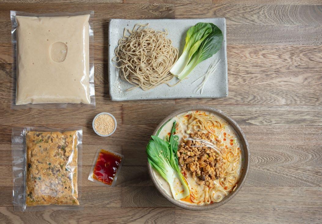 Tallarines preparados sin huevo, pechuga de pollo picada salteada al wok con shitake, calabacín y consomé de pollo con tahine, pimienta szechuan, ajonjolí, aceite de chile, ajo, cebolla, bok choy y salsa chashu (a base de soya y cerdo). $36.900