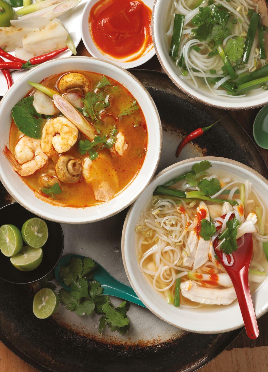 Consomédepollo,conpastadearroz,salsa deostras,cebollínorientalycilantro.Servida consalsasrirachaylimón.$29.900