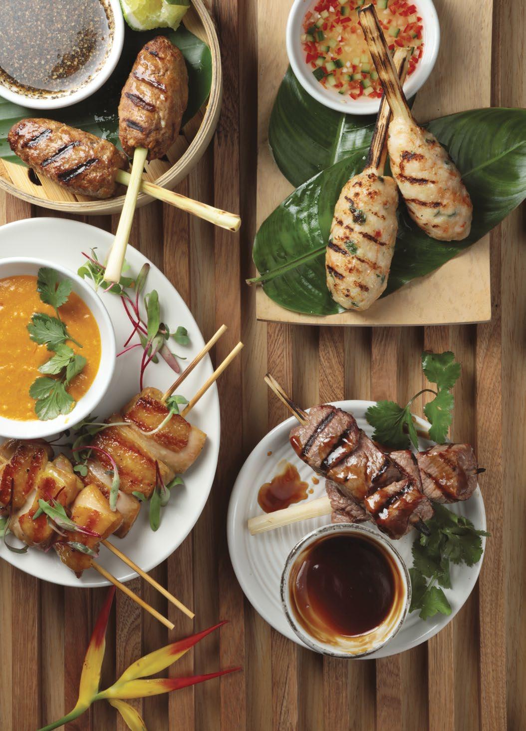 Camarones aromatizados en caña de azúcar, servidos con salsa vietnamita con nam-pla y maní. $26.900