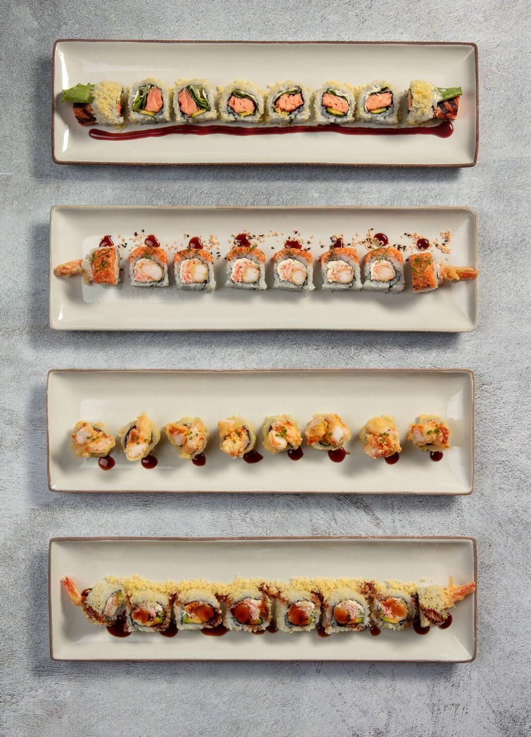 (4u) Salmón y aguacate. Langostino tempura. Plátano con aguacate, mango y queso. Palmito de cangrejo con aguacate y masago. $17.900