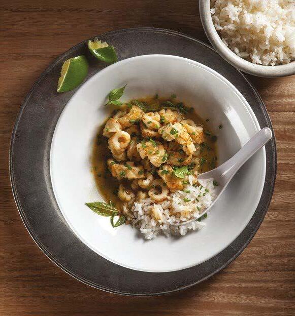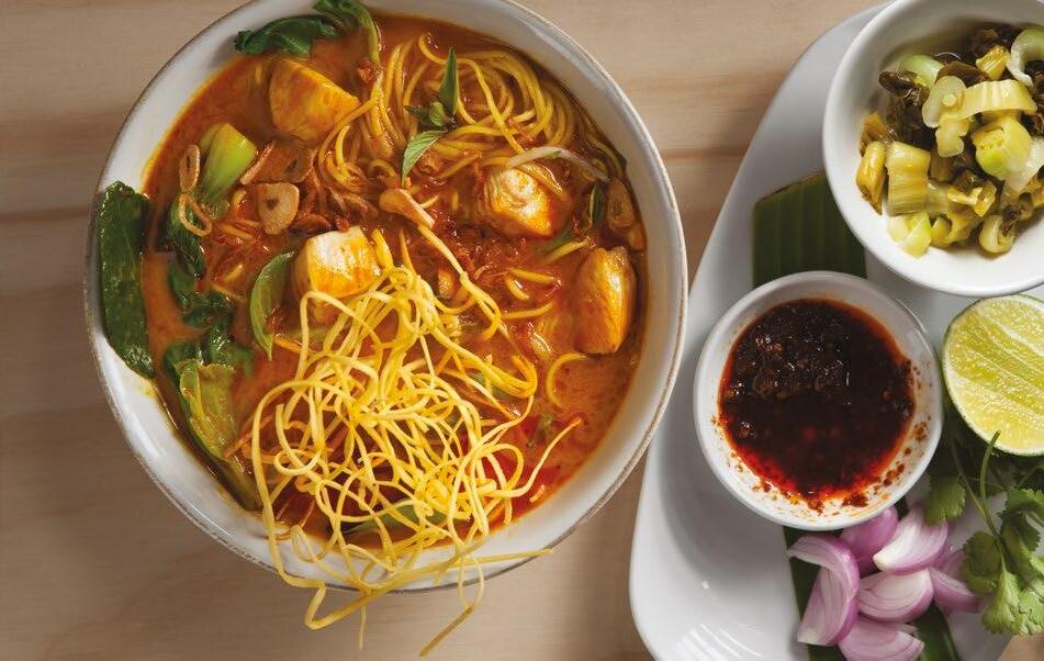 Pescado, camarones, calamares, pasta de arroz, chile, jengibre, limonaria, galanga, estrella de anís, albahaca siam y limón. $49.900