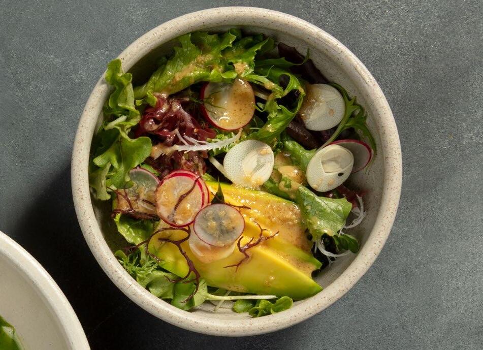 Mezcla de lechugas orgánicas con vegetales de temporada, tofu ahumado, algas marinas y ajonjolí, con una vinagreta de miso, tahine y jengibre. $29.900