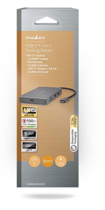This Nedis 7-in-1 USB 3.2 Gen 1 multi-docking adapter routes signals from USB- to HDMI , Ethernet and USB devices. Super-fast network connection via built-in Ethernet port (Gigabit) with a transfer rate of 5 Gbit/s. Additionally with USB A 3.2 Gen 1 socket for fast data transfer and charging. Additionally with USB-A 3.2 Gen 1 socket and USB3.2 Gen 1 socket for fast data transfer and charging. USB Power Delivery technology enables charging of end devices with a voltage of up to 100 W. This means it’s ideal for notebooks, but also hubs or docking stations can be charged without problems. The docking is also equipped with a (Micro)SD card reader.
