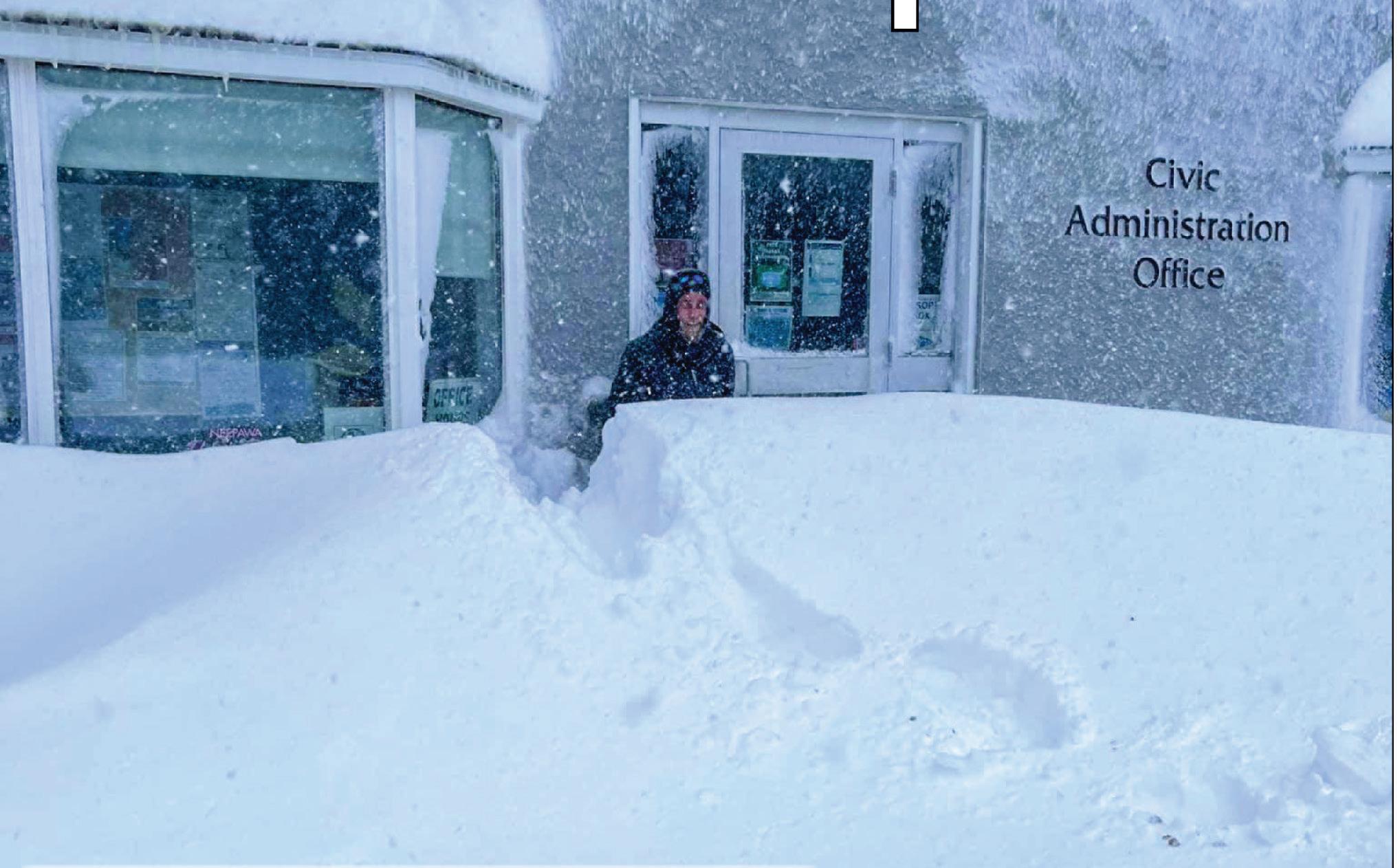 April 2022: A large snowstorm passed through Neepawa and surrounding area for several days before and during the Easter long weekend. Pictured: Cody Cicholski starts clearing away a large swath of snow that accumulated in front of the Town of Neepawa Administration Office.