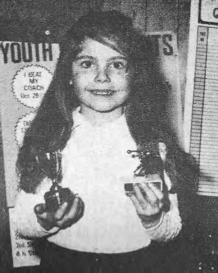 Sandra Johnson, age six, was the smallest bowler in the Squirt League, which was held at Evans Lanes in 1973. Pictured here, Sandra proudly holds her trophies, as she was also a member of the winning team.