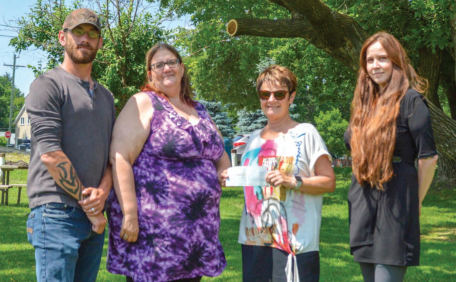 From left to right: Jeff Desender, Melissa Payette, Diane Martin and Melissa Parayeski. Desender, Payette and Parayeski, representing the Frozen Fire Studios Sober Social Committee, handed a $625 cheque to Martin of Miles for Mental Health.