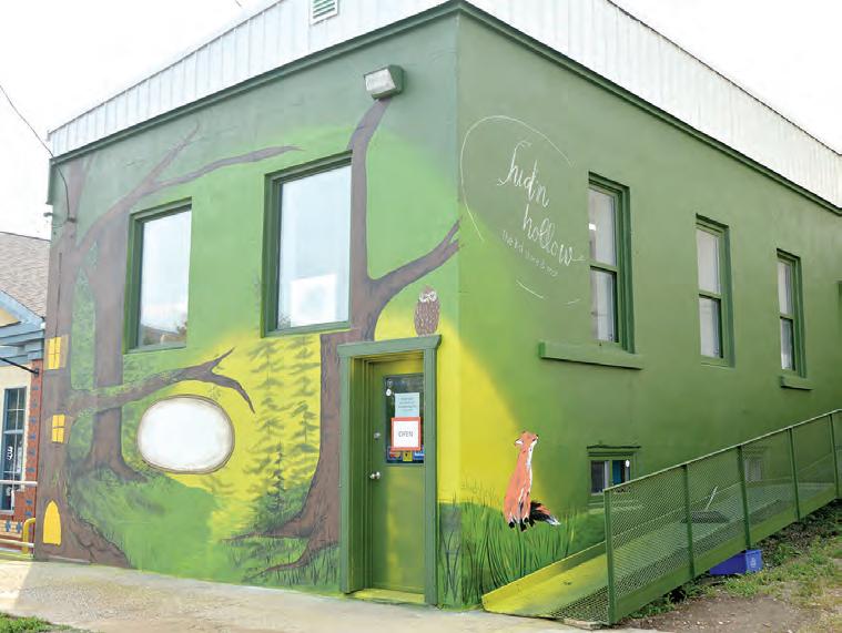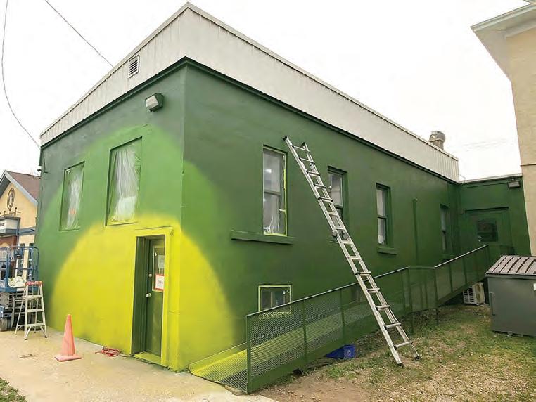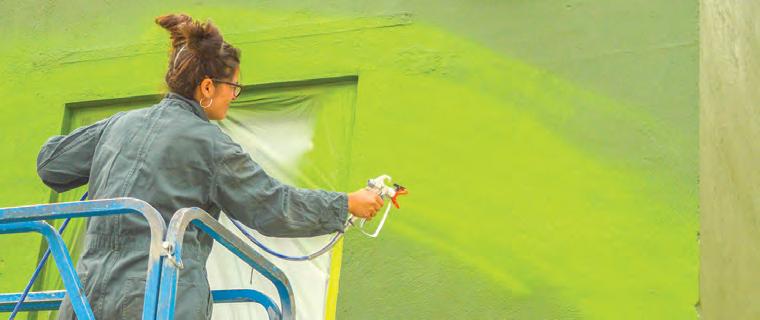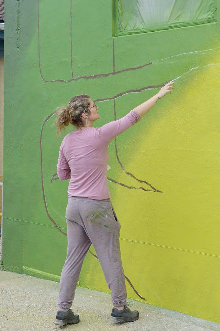 Top left: Shades of green were applied to act as a base for the mural. Peters can be seen applying a coat of the paint in the photo pictured at the bottom right.