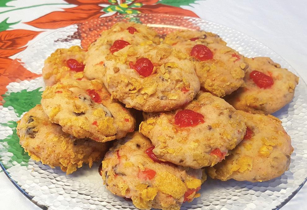 2 1/2 cups corn flakes, slightly crushed maraschino cherries drained and cut into quarters for garnish