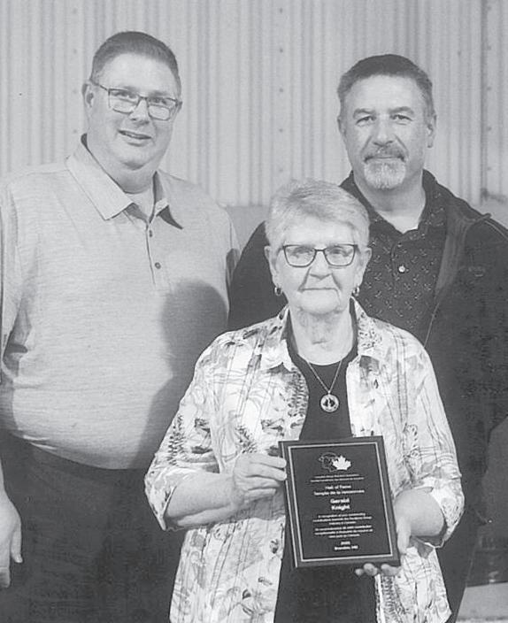 At the Canadian Sheep Breeder Association banquet on July 11, 2025 in Brandon, a representative of the Association presented a Hall of Fame plaque to honour the late Gerald Knight. Accepting the award were Scott, Craig, and Carol Knight.