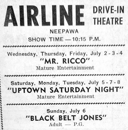 Neepawa used to have a drive-in theatre! This ad for the Airline Drive-in in Neepawa was in the July 3, 1975 edition of the Press.