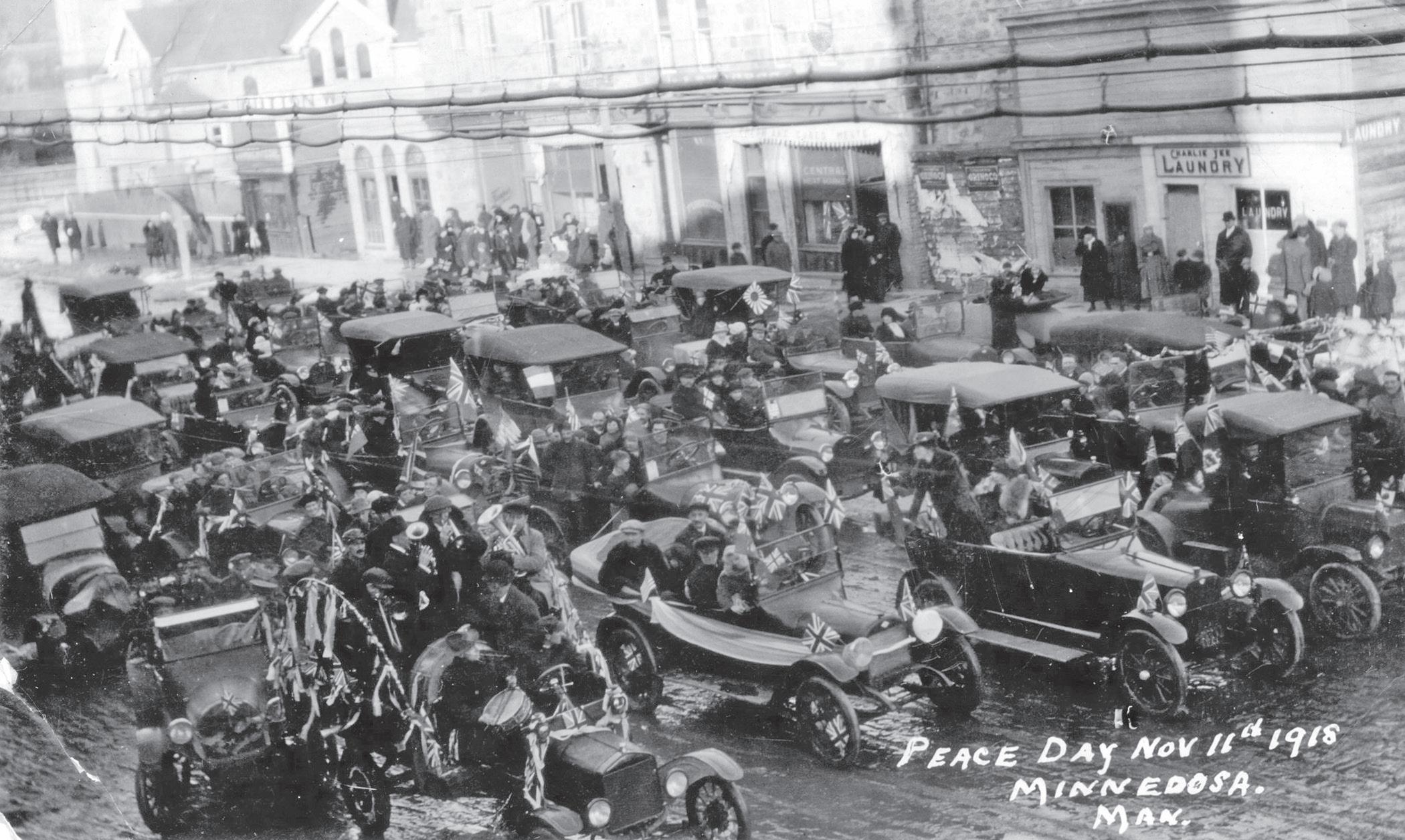 As of Nov. 11, 2025, this photo will be 107 years old. The photo depicts people gathered on the streets and sidewalks of Minnedosa to celebrate the end of World War I (WWI) on Peace Day (Nov. 11, 1918).