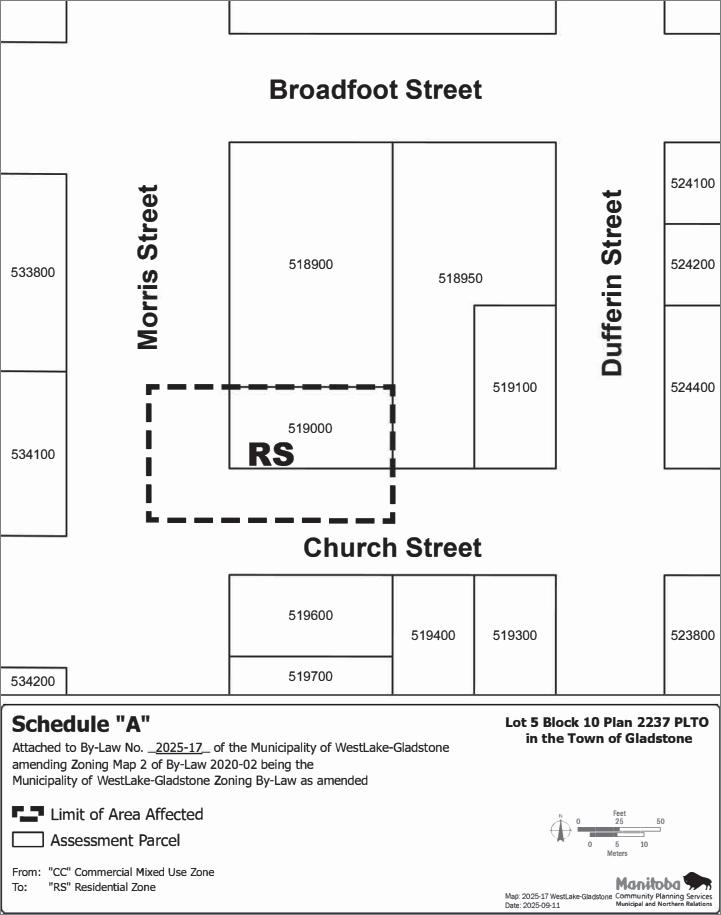 The Municipality of WestLake-Gladstone, under the authority of The Planning Act, will hold a PUBLIC HEARING at 14 Dennis St. Gladstone, MB on Wednesday November 19, 2025 at 10:00 am at which time and place Council will receive written or verbal representations from the applicant and any persons who wish to make them in respect to the following application matter: