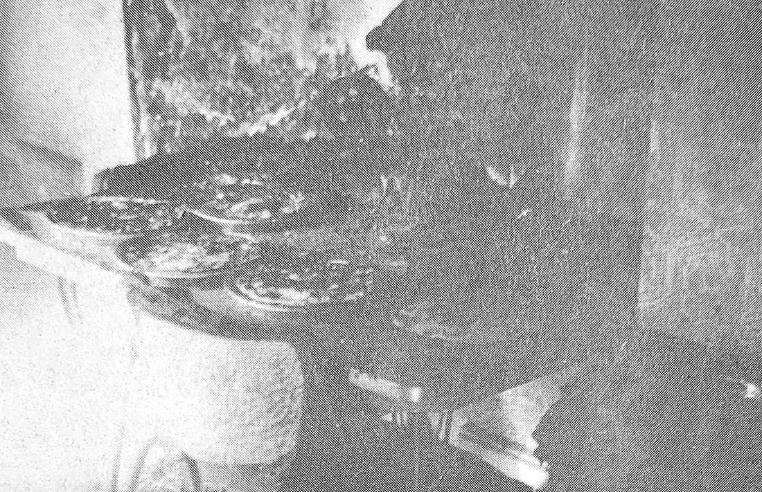 Pictured above is a kitchen table, home to a batch of pies that had previously been baked and– after being set to cool– ended up just a bit too crisp in April of 1975. This was due to an unexpected fire of unknown cause that broke out. Nobody was injured in the incident.