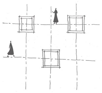 Basic design principles; balance and symmetry. Introducing cross wall and providing the walls with cut-outs, allowing play of light.